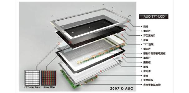 液晶显示器的构造如同三明治一般,将液晶夹在两片玻璃基板之间,这两片玻璃基板就是TFTArray玻璃与彩色滤光片。TFTArray玻璃上面有无数的画素(pixel)排列,彩色滤光片则是画面颜色的来源,液晶便夹在TFTArray以及彩色滤光片之间。当电压施于TFT(晶体管)时,液晶转向,光线便穿过液晶在面板上产生一个画素,而此光源则是由背光模块负责提供。此时,彩色滤光片给予每一个画素特定的颜色。结合每一个不同颜色的画素所呈现出的,就是面板前端的影像。